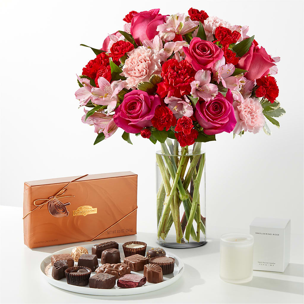 Blushing shades of pink blooms are nestled in lush greens to charm anyone's day. This bouquet is abundant with a classic assortment of pretty florals – roses, alstroemeria and carnations to name a few.